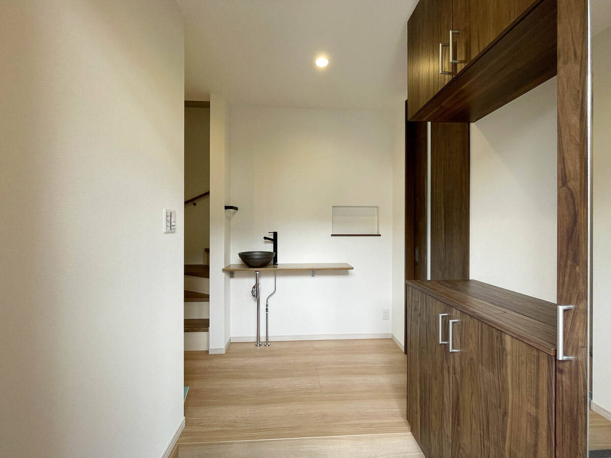 外観は今どきのダークブラウン色を採用し、内装はホワイトを基調にし建具はダーク系に合わせました。